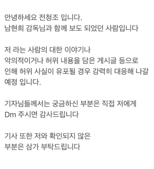 전씨 역시 지난 24일에 "저라는 사람에 대한 이야기, 악의적이거나 허위 내용을 담은 게시글 등으로 인해 허위 사실이 유포될 경우 강력히 대응해 나갈 예정"이라고 밝혔다.